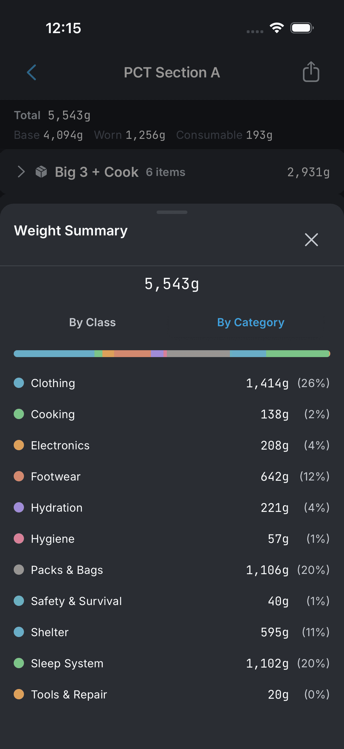 Category breakdowns, base weight vs. consumables. See exactly what's in your pack.